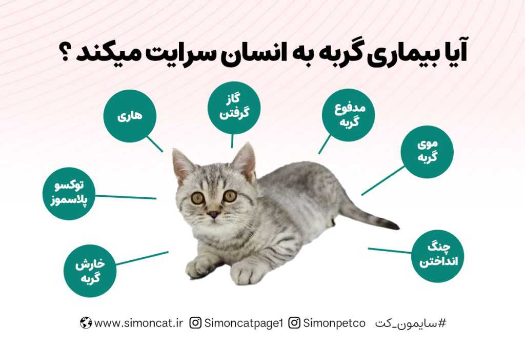 آیا بیماری گربه به انسان سرایت میکند؟ موضوعی که در سایت سایمون کت به تحلیل آن خواهیم پرداخت. اگر شما هم یکی از افرادی هستید که علاقه زیادی به نگهداری از گربه دارید ولی از خود میپرسید که آیا بیماری گربه به انسان سرایت میکند؟ در جواب این سوال باید بگوییم که بیماری هایی وجود دارند که از گربه ها به انسان سرایت میکنند. ولی به این معنا نیست که شما فکر کنید هر زمانی که گربه شما مریض شد، شما نیز به آن مریضی دچار خواهید شد.