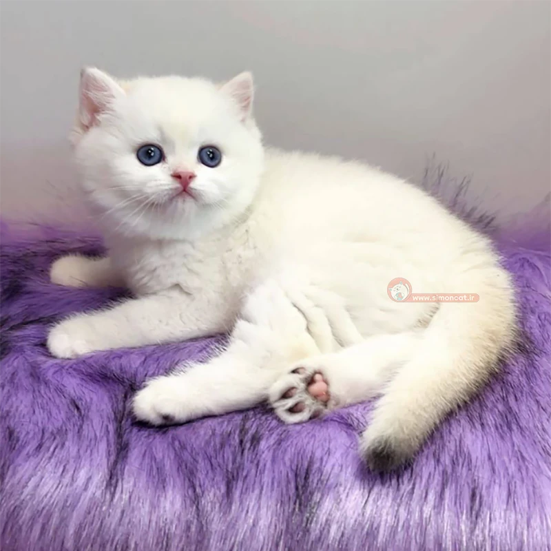 بچه گربه بریتیش سفید چشم آبی کد 89، 53 روزه و نر هست. جثهی گرد و تپلی داره و رنگش مثل برف سفیده. روی دمش یه کم رنگ تیره داره. روی پنجولاش صورتی و بامزست. دماغ و دهن ناز و کوچولویی داره. کنارههای لبش انگار که دوتا گردو کوچولو قایم کرده. گوشهای کوچولو و نوک تیزش رنگش صورتیه. چشمای درشت و خوشگلی داره که آبی رنگه. طرز نگاهش خیلی جذابه. خرید گربه بریتیش بهترین گزینه برای افرادی هست که در آپارتمان زندگی میکنن. چون آرومه و از وسایل بالا نمیره و به اونها آسیب نمیزنه و سر و صدا نمیکنه که همسایهها شاکی بشن. دوست داره کنار شما باشه و بهش توجه کنید. توی مهمونی یا محیطهای جدید با آدما و حیوانات دیگه میتونه ارتباط خوبی بگیره.