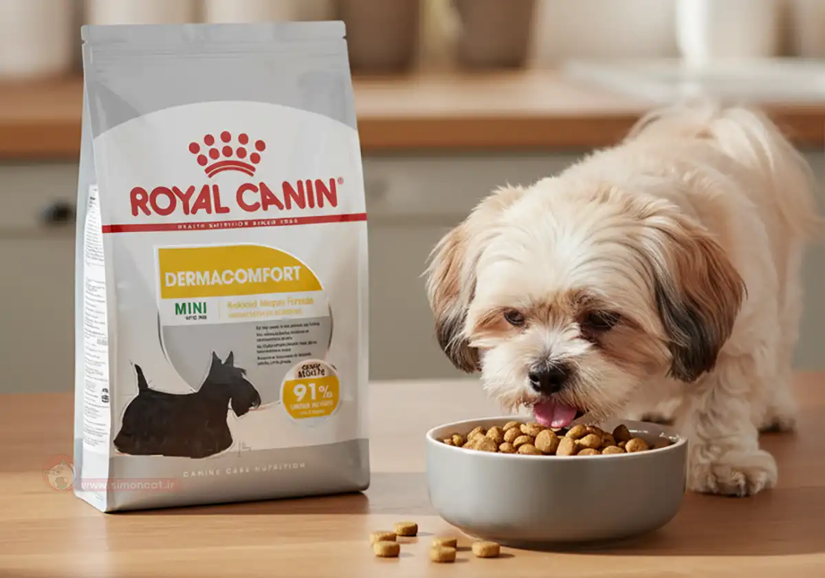 روش مصرف غذای خشک سگ مینی درماکامفورت برند رویال کنین