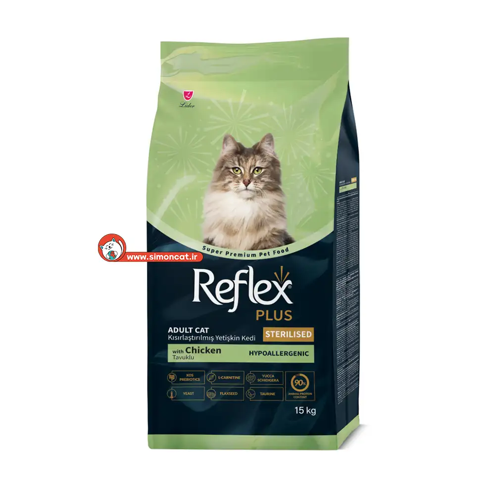 غذای خشک گربه ReflexPlus Sterilised با طعم مرغ، محصولی سوپر پریمیوم و متعادل است که با پروتئین مرغ باکیفیت، پربیوتیک‌ها، دانه کتان، ال-کارنیتین و تائورین به حفظ سلامت قلب، چشم، گوارش، پوست و مو و کنترل وزن گربه‌های بالغ عقیم شده کمک می‌کند.