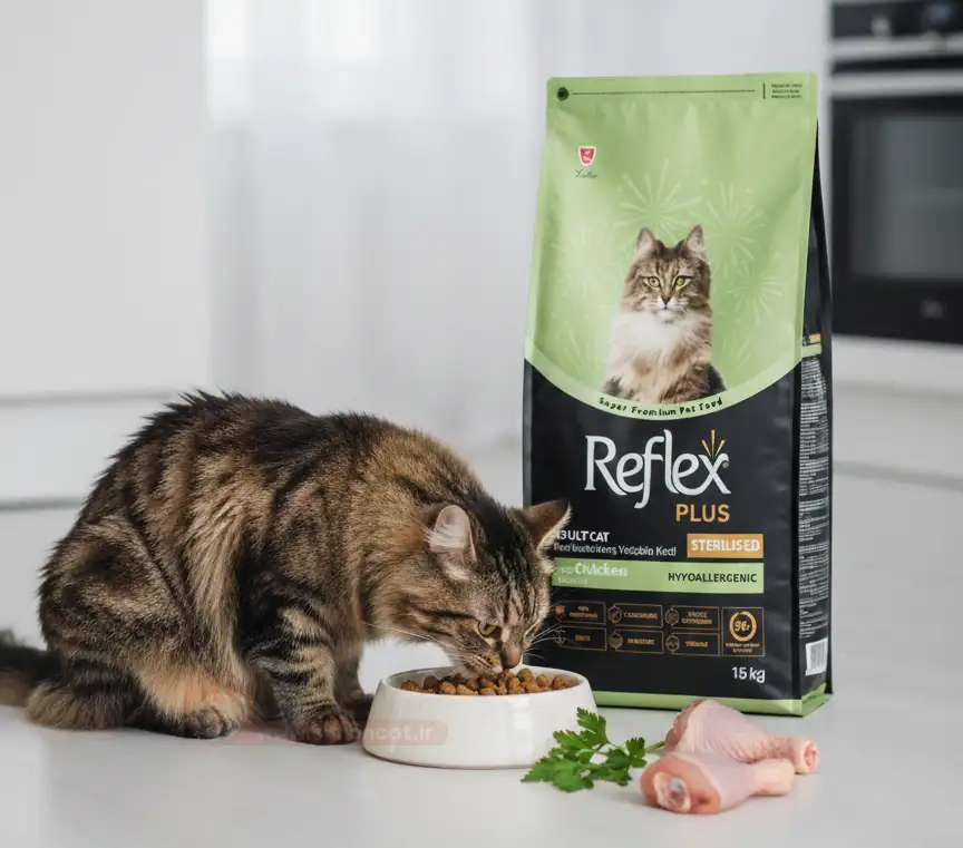 نحوه مصرف غذای خشک گربه عقیم شده با طعم مرغ رفلکس پلاس