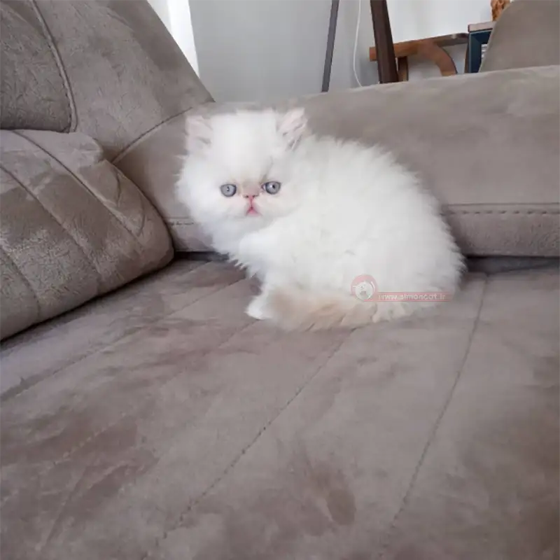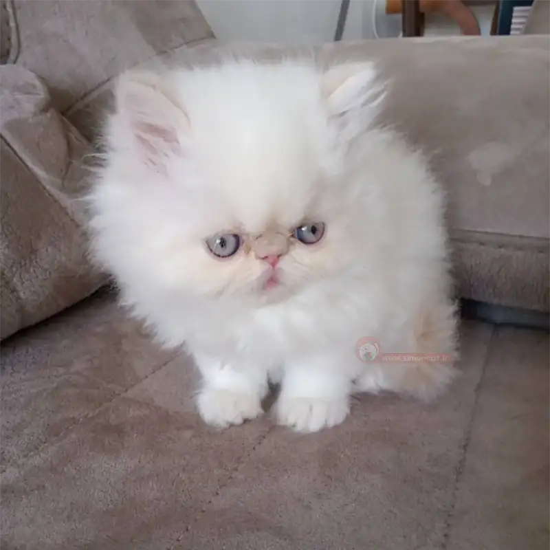 گربه پرشین سفید چشم آبی یکی از پرطرفدارترین نژادهای گربه است. جنسیت این گربه زیبا نر هست و تازه ۵۵ روزه شده. چشمهای گرد و درشت داره که مثل تیلههای سبز رنگه که با هالهای آبی رنگ پوشیده شده. دستهای تپل و پشمالویی داره که دل هر آدمی واسش ضعف میره. صورتش خیلی جمع و جور و بامزه است و سیبیلهای خوشگلی داره. یه قیافه خاصی داره که در کنار موهای بلند و سفیدش خیلی جذابه. پرشین کت ما یه کوچولو روی دمش کرمی رنگه و این رنگ رو یکم توی صورتش هم داره. دماغ و دهن کوچولویی داره. گربه پشمالو هنوز خیلی آرومه و سروصدای زیادی تولید نمیکنه و بیشتر ترجیح میده کنار شما دراز بکشه و توی خونه قدم بزنه. به شما خیلی وابسته میشه و وفاداره. اگر توی خونهتون بچه دارید یا حیوون خونگی دیگهای دارید، این گربه خیلی برای شما مناسبه چونکه با اونها سازگار میشه و دوست میشه باهاشون.