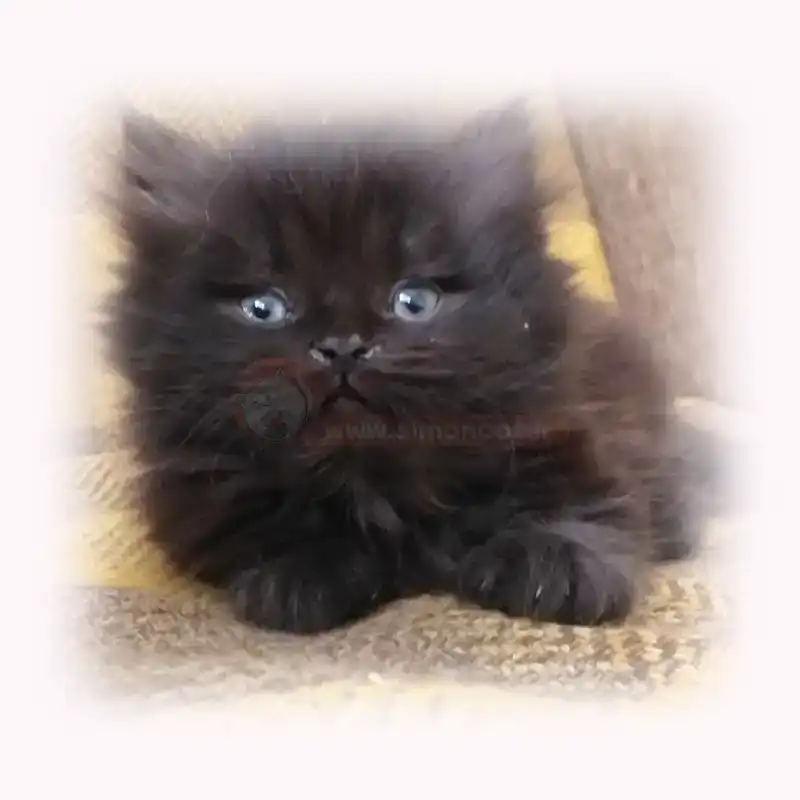 گربه پرشین مشکی پشمالو، موهای مشکی پُر با دو چشم خاکستری دارد و بینی سیاه پهن با دهان کوچکی دارد. دستهای پشمالوی آن ناخنهای سفید و تیزش را پنهان کرده.